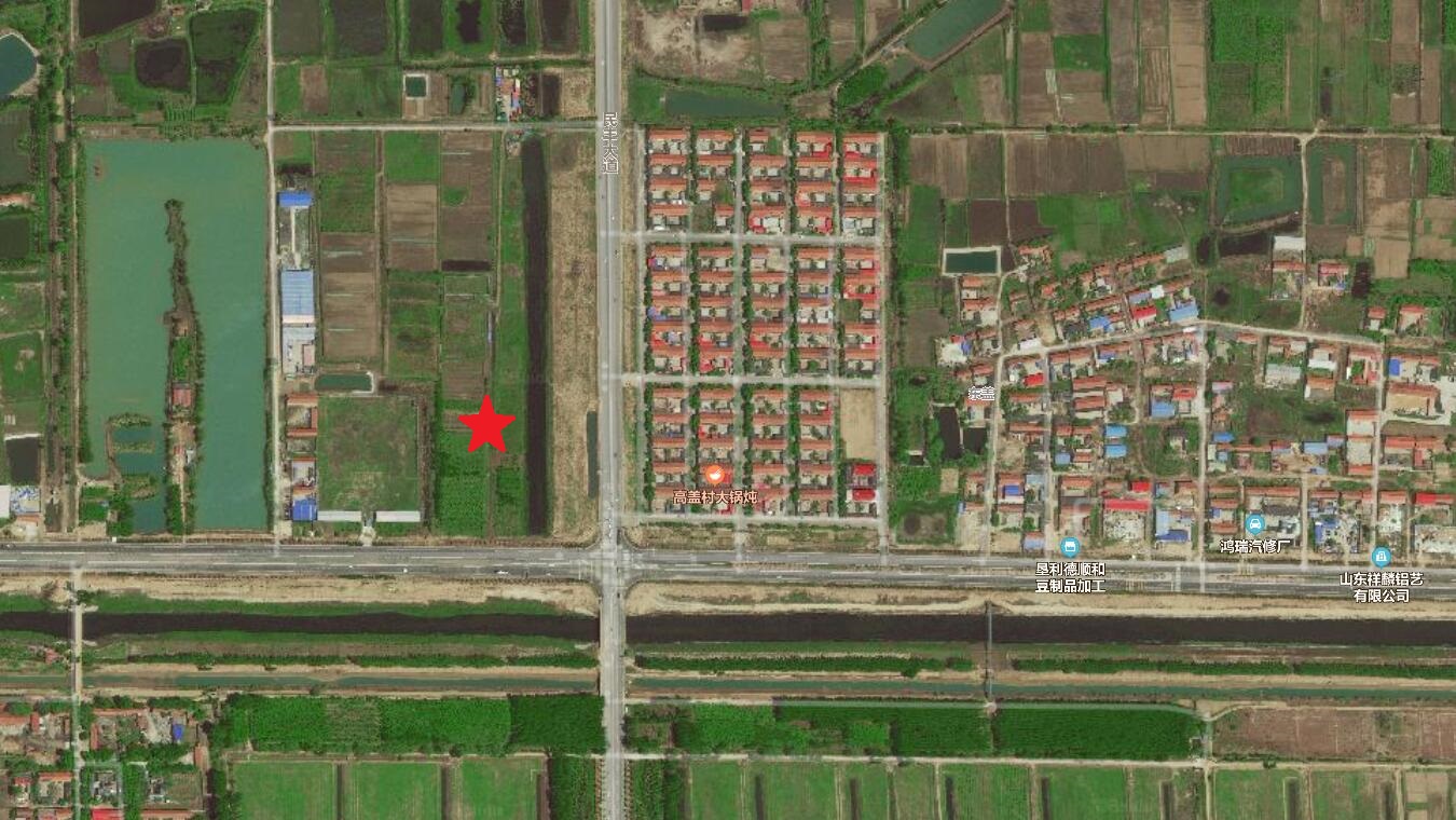 該項(xiàng)目距離東側(cè)民豐路路邊46m,該加油站位于東營(yíng)市墾利區(qū)德州路與民豐路交叉口西北側(cè)。東側(cè)為民豐路,用地邊界距路邊46m,路東距用地邊界約100m處為高蓋村(人口約800人),其村內(nèi)幼兒園距站區(qū)邊界約720m。南側(cè)為德州路,用地邊界距路邊8.5m,路南為空地。西南方向約400m處為王營(yíng)村。西側(cè)為樹(shù)林,北側(cè)為空地。 |