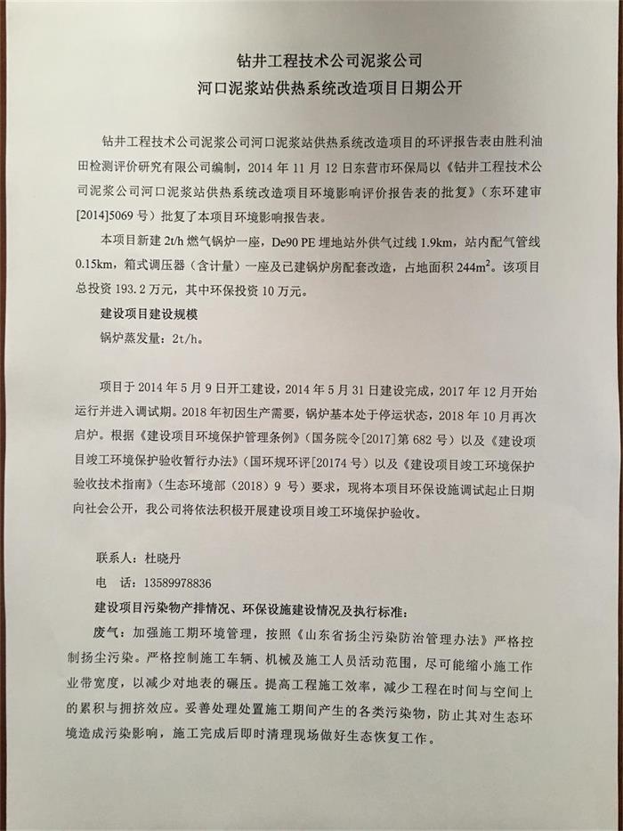 鉆井工程技術公司泥漿公司河口泥漿站供熱系統(tǒng)改造項目日期公開