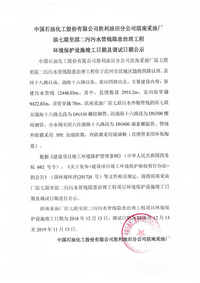中國石油化工股份有限公司勝利油田分公司濱南采油廠濱七聯(lián)至濱二污污水管線隱患治理工程環(huán)境保護設施竣工日期及調試日期公示