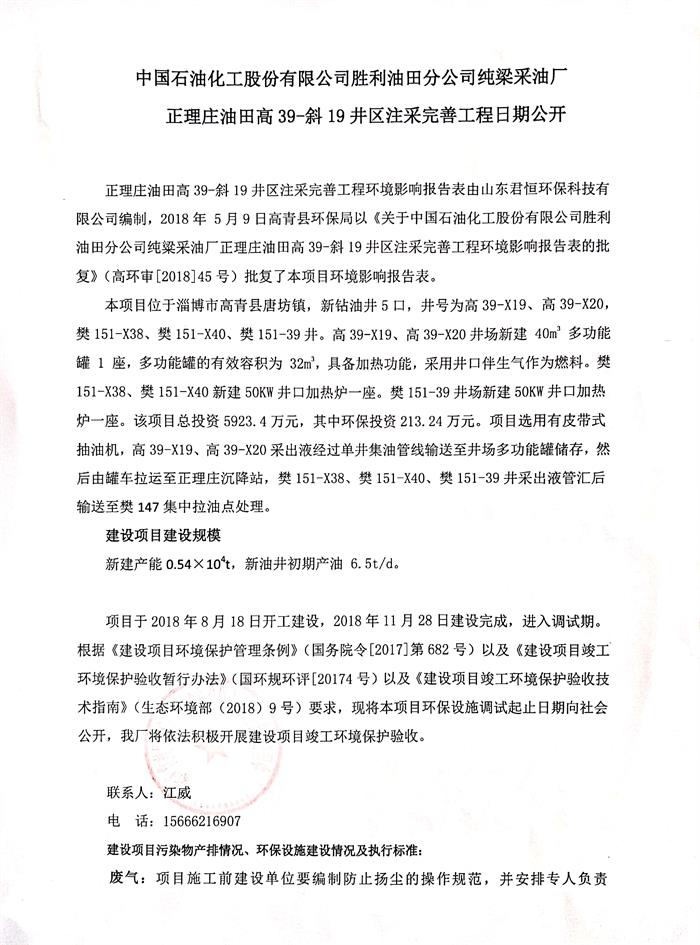 中國(guó)石油化工股份有限公司勝利油田分公司純梁采油廠正理莊油田高39-斜19井區(qū)注采完善工程日期公開(kāi)